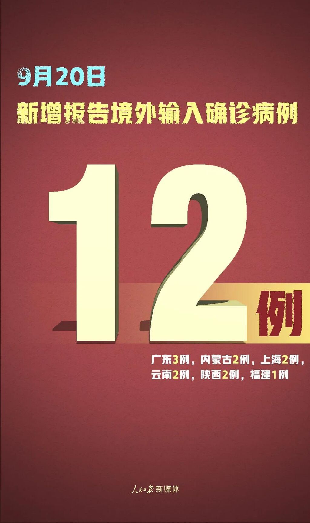 9月20日0—24时,31个省(自治区、直辖市)和新疆生产建设兵团报告新增确诊病例12例,均为境外输入病例(广东3例,内蒙古2例,上海2例,云南2例,陕西2例,福建1例);无新增死亡病例;无新增疑似病例。