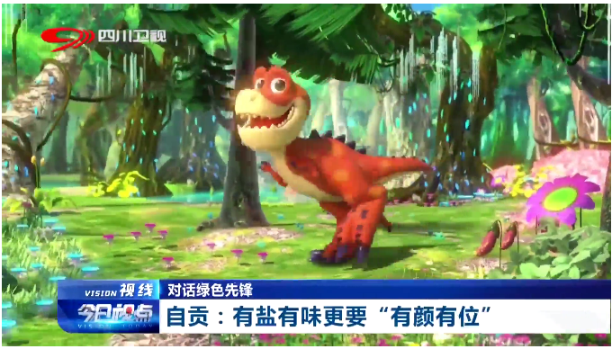 自贡市委副书记、市长 何树平:那么说到自贡,人们经常用一句话来描述,这是一座有“盐”有“味”的城市,盐当然是因为自贡有2000年的盐业史,有“味”当然是自贡有麻辣鲜香俱全的独具特色的盐帮菜。当然自贡不仅有盐有味,还有千年的彩灯文化,还有亿万年的恐龙群窟。说到恐龙,去年我们特地推出了恐龙形象的城市超级IP,拍了一部动漫片叫《时空龙骑士》,其中的主角就是燊海。今天也一起跟我们来到了演播厅,下面,我们想请燊海带领大家一起去感受一下自贡这座有颜有味的城市。