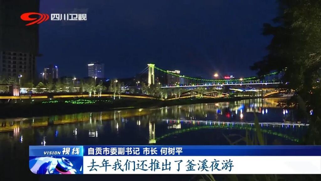 自贡市委副书记、市长 何树平:是的,随着它的生态环境的不断改善,那么这座城市的品位越来越足了,我们经常用两句话来描述它,那么白天是“半城青山半城楼”,晚上“彩灯辉映碧水流”,这个态势正在加速呈现。那么具体这个城市今天是一个什么形态呢?我想也请大家去看一看。