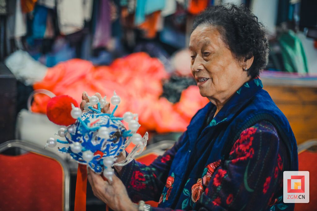 图:90岁的盛伯华老人,人称“盛二姐”。12岁开始就在市川剧团里长大。收拾得干干净净的盛二姐烫着卷头,总来听戏。她说,现在,费力的戏是唱不了了,每次来都听曾团长安排,需要哪个配角,她就演哪个。