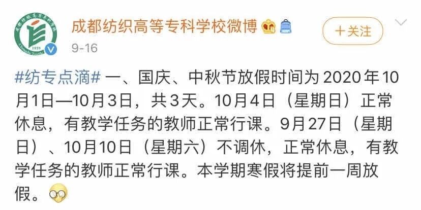 目前,放8天的学校有电子科大、西南民大、成都信息工程大学、西华大学、四川农大、成都中医大、四川师范大学、四川轻化工大学、四川文理学院、四川旅游学院、乐山师范学院、成都医学院、四川交通职业技术学院、四川大学锦城学院等。