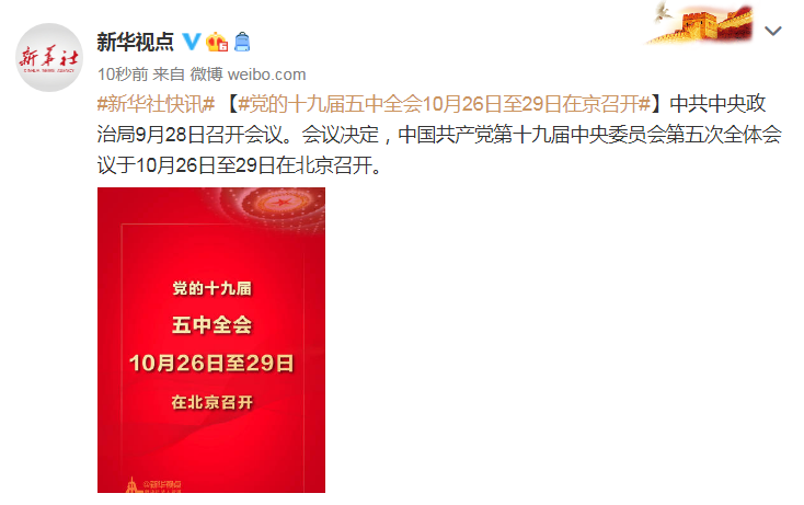 中共中央政治局9月28日召开会议。会议决定,中国共产党第十九届中央委员会第五次全体会议于10月26日至29日在北京召开。
