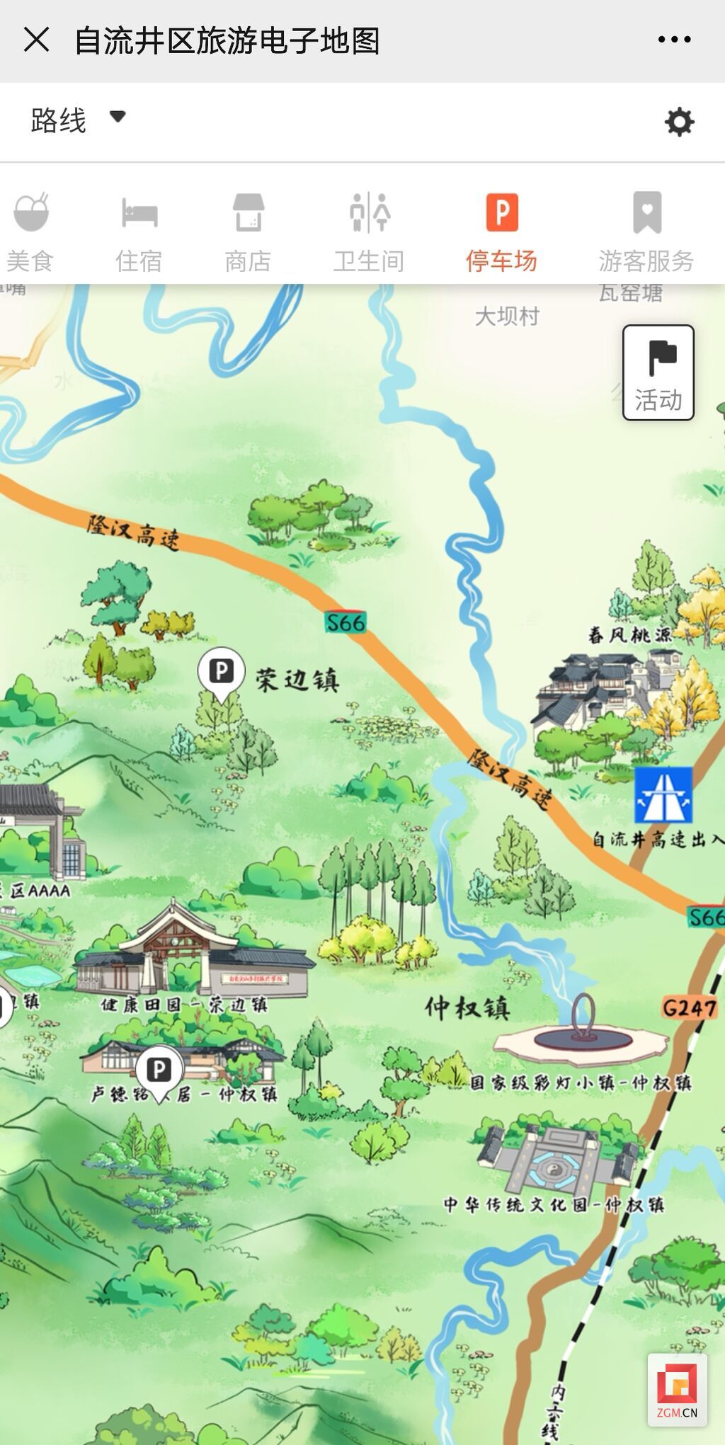 识别二维码就可以登录地图,这份电子地图包含了解说、美食、住宿、商店、卫生间、停车场、游客服务七大板块。选择您想去的地点,就可开始导航;点击活动即可获得推荐出行线路,其中包含城区夜游线路,城区游玩线路,乡村游线路,你想要的这里都有。