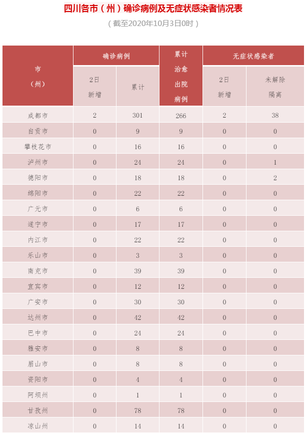 10月2日0-24时,全省新增无症状感染者2例(境外输入,均为10月1日自埃塞俄比亚乘机抵蓉,10月2日核酸检测阳性),当日转为确诊病例1例,当日解除集中隔离医学观察2例,尚在集中隔离医学观察41例(均为境外输入),比前一日减少1例。