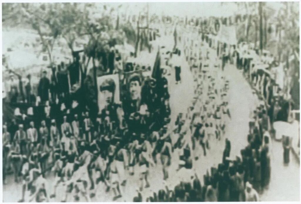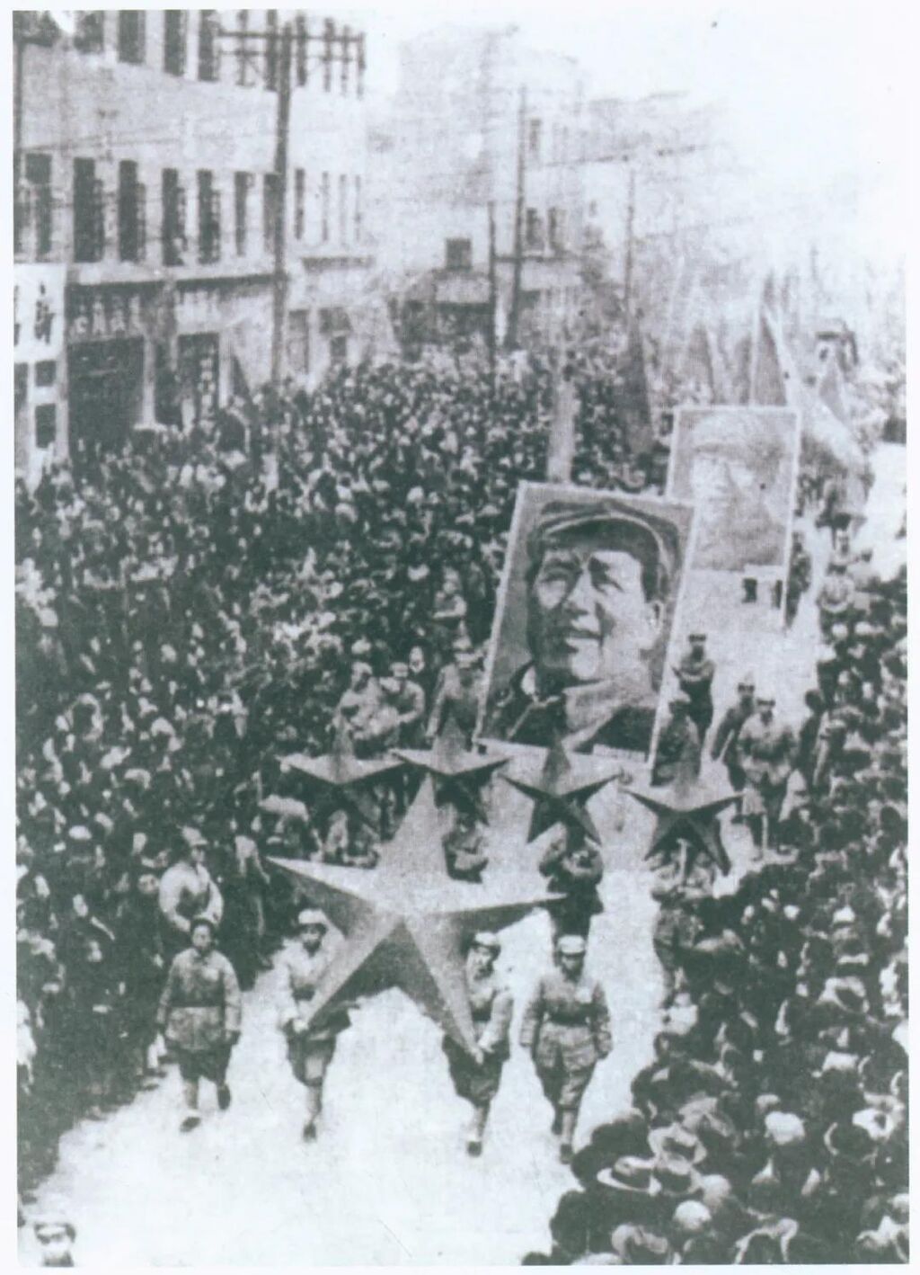 ▲解放军第十八兵团高举毛泽东和朱德画像,浩浩荡荡开进成都