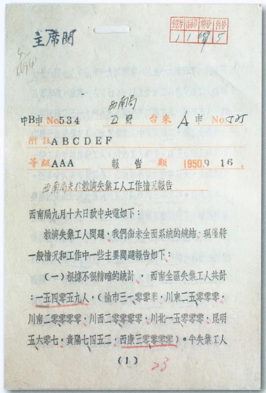 ▲1950年9月16日,中共中央西南局关于救济失业工人工作情况报告(部分)