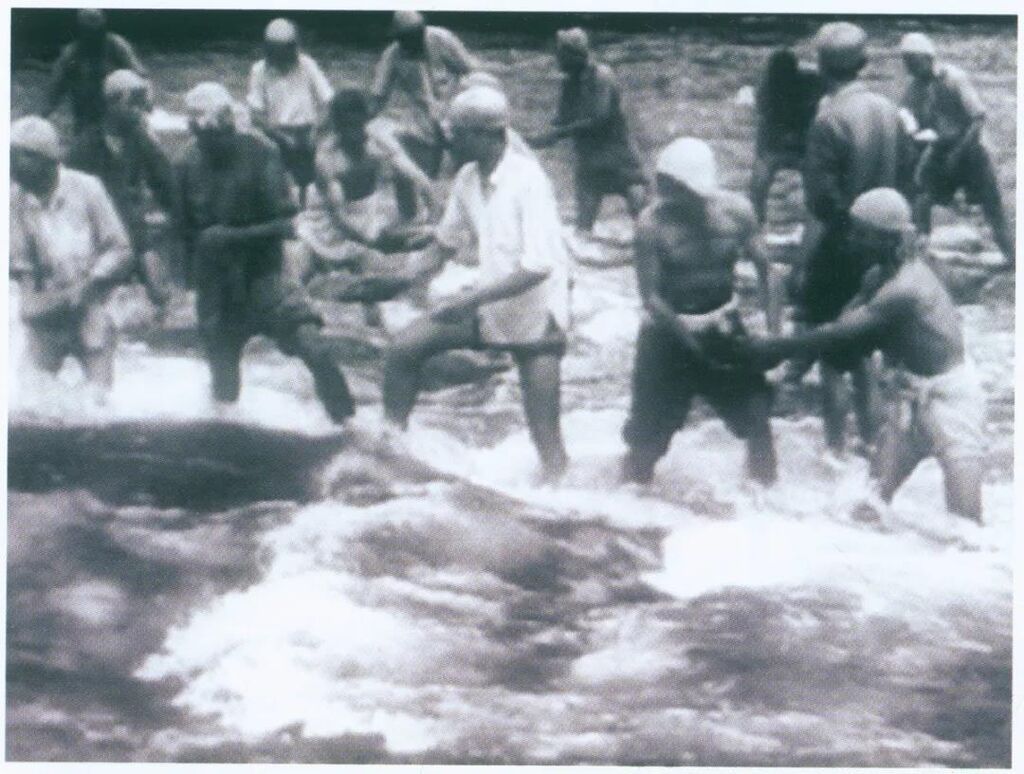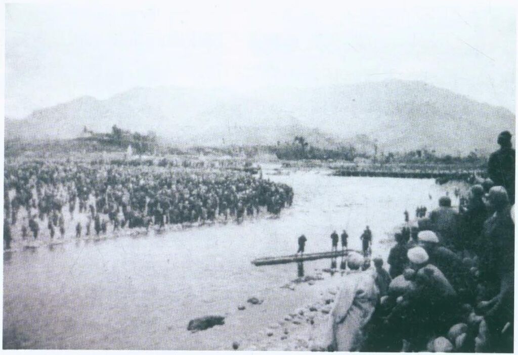 ▲1950年1月3日,解放军第十八兵团司令部与成都市军管会决定拨款3万银元,组织军民抢修都江堰,经过两个多月的奋战,完成了都江堰岁修任务,并于4月2日举行开水典礼,保证了川西平原数万顷良田得到及时灌溉。图为军民跳进刺骨的岷江水中进行抢修