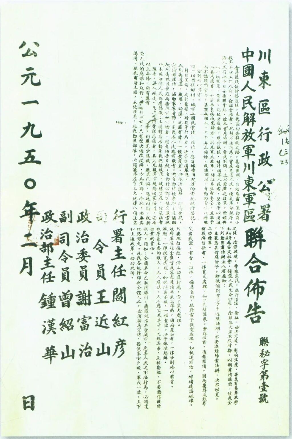 ▲1950年2月,川东区行政公署、川东军区关于剿匪肃特办法的联合布告