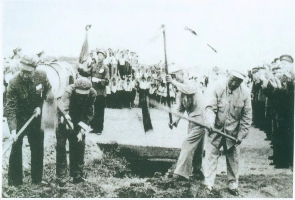 ▲1950年6月15日,成渝铁路正式开建。西南军区抽调指战员及军工3万多人,作为筑路的开路先锋和主力。此外,中共四川各区各级党委、政府动员各县民工10万多人,陆续到达铁路沿线施工筑路。图为成渝铁路开工仪式