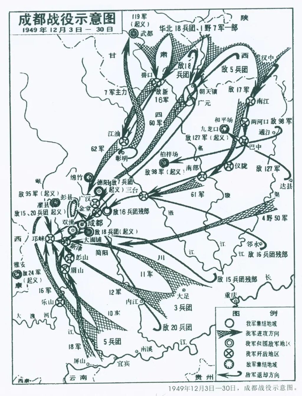 1949年10月1日开国大典之后,中国人民解放军第一、第二、第四野战军奉命进军西南。11月1日,刘伯承、邓小平指挥第二野战军主力和第四野战军一部发起川黔战役,击溃国民党军川东防线,于11月30日解放重庆,并乘胜进击,迅速控制了从简阳到邛崃的大片城镇,截断了国民党军南逃路线。12月5日,贺龙指挥的第十八兵团和第一野战军一部,从秦岭入川,攻占广元、绵阳等川西、川北城市。各路解放大军直指川西,成都处于人民军队包围之中,国民党军胡宗南部第五兵团企图突围,在邛崃一线被歼灭。12月9日,西康省主席刘文辉和西南军政长官公署副长官邓锡侯、潘文华在彭县(今彭州市)联名通电全国,宣布起义,西康和平解放。12月27日,成都解放。