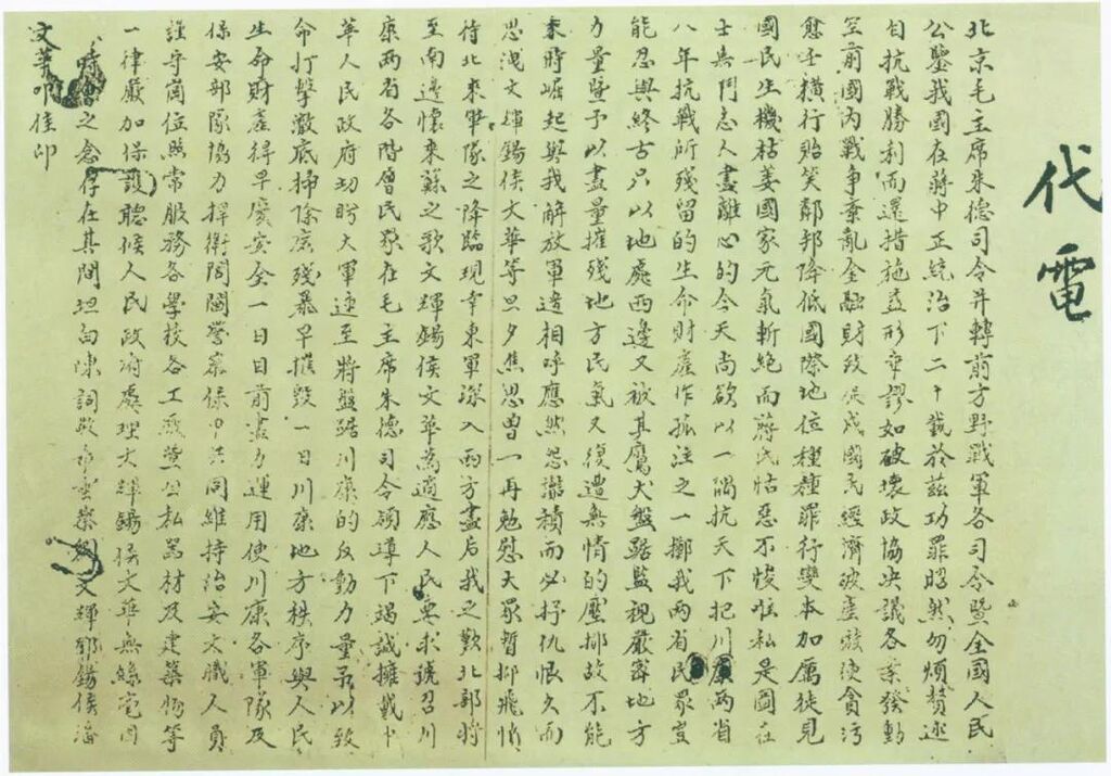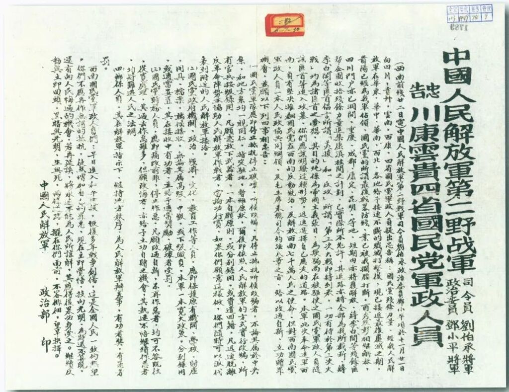 ▲1949年11月21日,刘伯承、邓小平致川康云贵四省国民党军政人员四项忠告