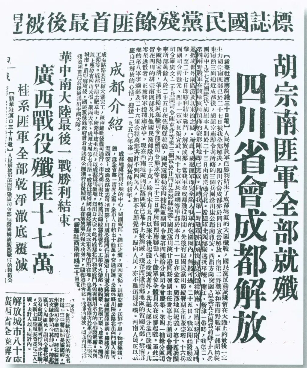 1950年2月6日,化装潜逃的原四川省政府主席王陵基在江安县一艘轮船上被生擒。3月,逃到西昌负隅顽抗的胡宗南残部也被解放军聚歼。至此,国民党政权在大陆的最后一个据点被拔除,四川、西康大部分地区宣告解放,历史翻开了崭新一页。