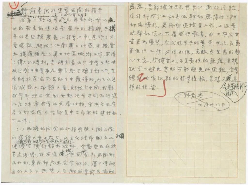 ▲1949年7月第二野战军前委关于进军西南的指示(部分)