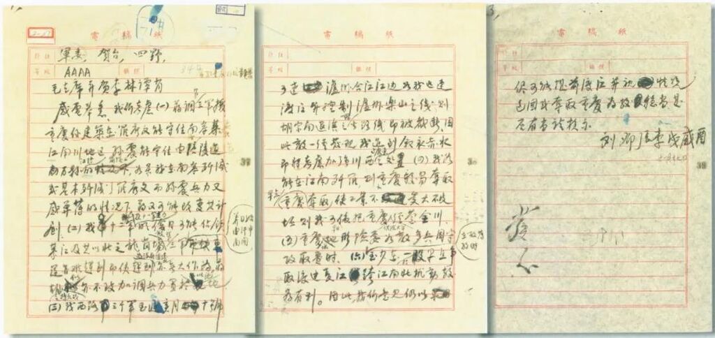 ▲1949年11月27日,邓小平起草的刘伯承、邓小平、张际春、李达为提前渡江并视情况包围或夺取重庆为较稳当致毛泽东并贺龙、李井泉、林彪、谭政、肖克的电报