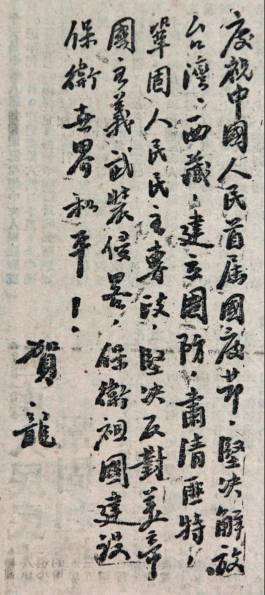 ▲1950年10月1日,《新华日报》刊登的贺龙为庆祝第一个国庆节的题词