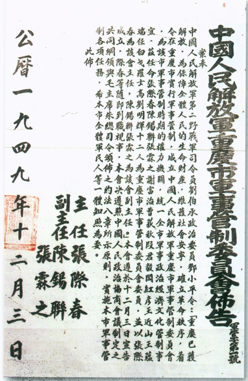▲1949年12月3日重庆市军事管制委员会正式成立的布告