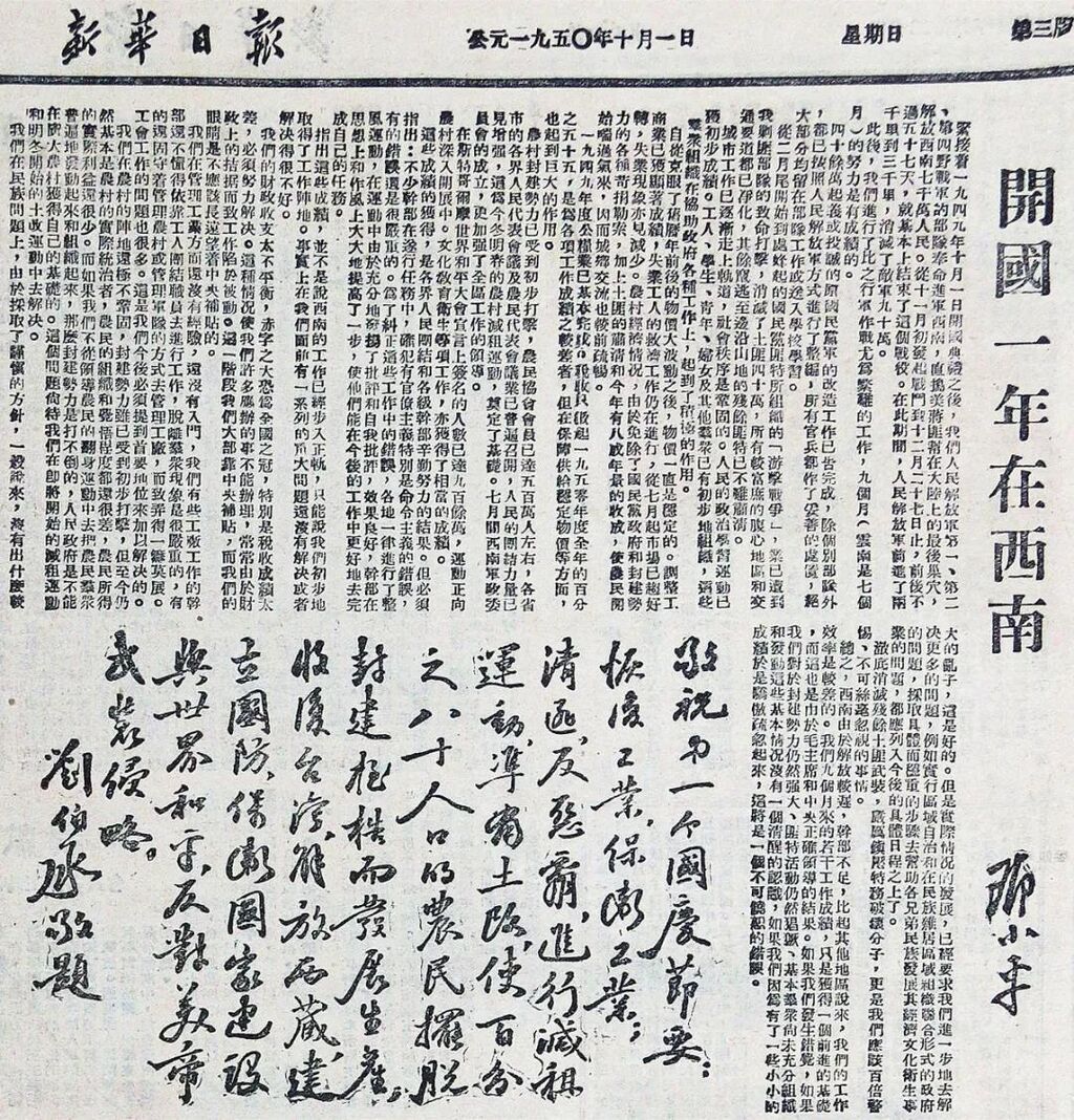 ▲1950年10月1日,《新华日报》刊登的刘伯承为庆祝第一个国庆节的题词和邓小平的署名文章