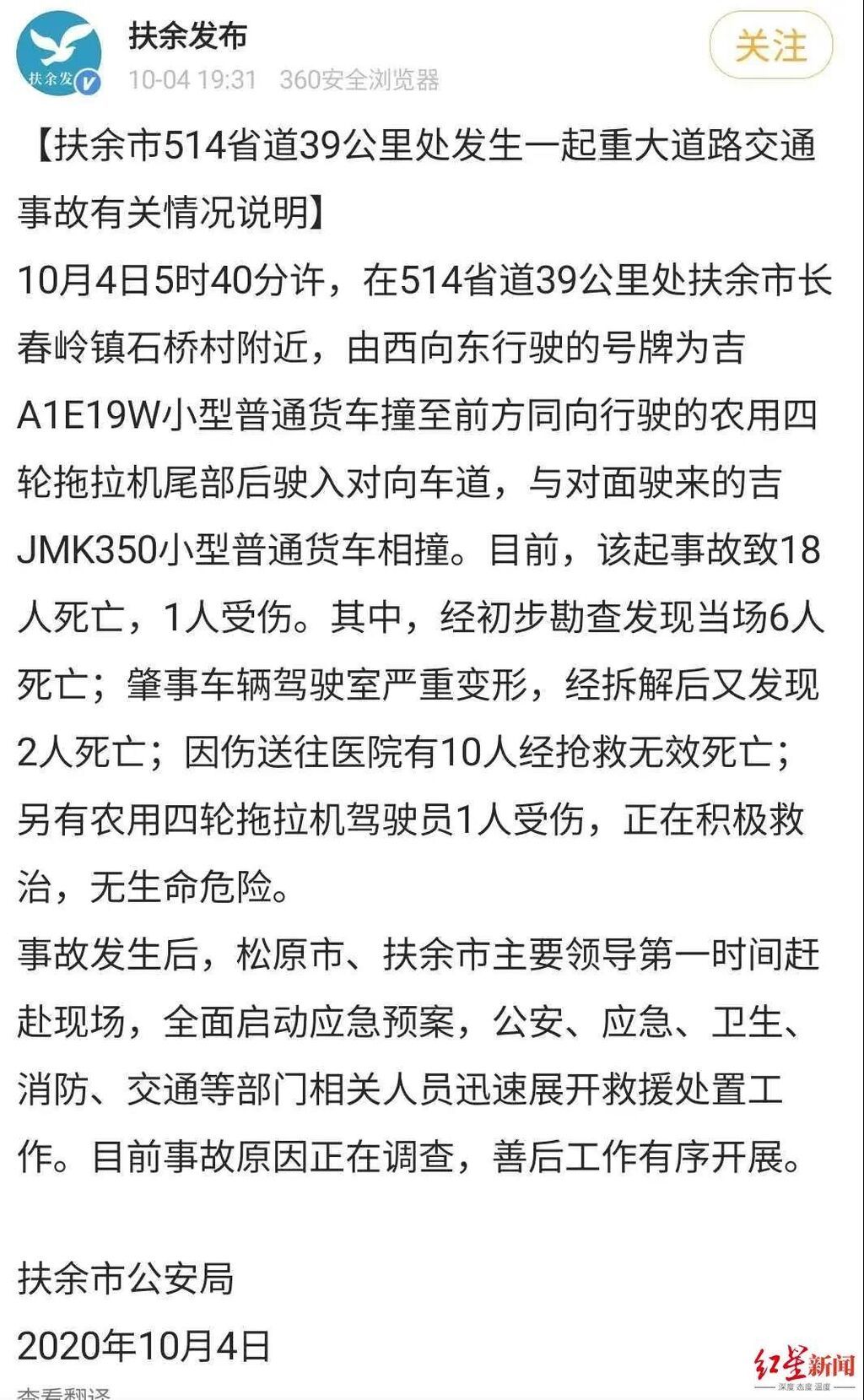 4日19时30分许,扶余市公安局发布情况说明称,当天5时40分许,在514省道39公里处扶余市长春岭镇石桥村附近,由西向东行驶的号牌为吉A1E19W小型普通货车撞至前方同向行驶的农用四轮拖拉机尾部后驶入对向车道,与对面驶来的吉JMK350小型普通货车相撞。目前,该起事故致18人死亡,1人受伤。其中,经初步勘查发现当场6人死亡;肇事车辆驾驶室严重变形,经拆解后又发现2人死亡;因伤送往医院有10人经抢救无效死亡;另有农用四轮拖拉机驾驶员1人受伤,正在积极救治,无生命危险。