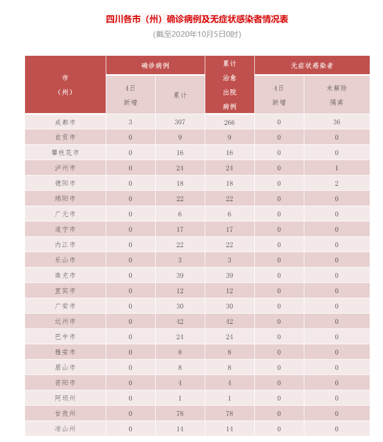 10月4日0-24时,四川新增新型冠状病毒肺炎确诊病例3例(境外输入,均为10月3日自埃及乘机抵蓉,10月4日确诊),无新增治愈出院病例,无新增疑似病例,无新增死亡病例。