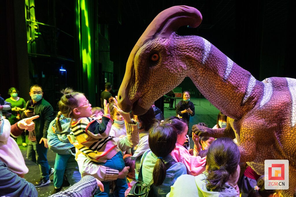 从当天19时,观众陆续进场开始,自贡杂技团就不断给观众朋友带去意外和惊喜!在迎宾区域有仿生恐龙的表演,还有演员装扮的“滑稽龙”为小朋友们送上各式各样的气球,此外还有自贡的城市IP“时空龙骑士”公仔玩具与大家见面,让进场观众感受到不一样的节日气氛。