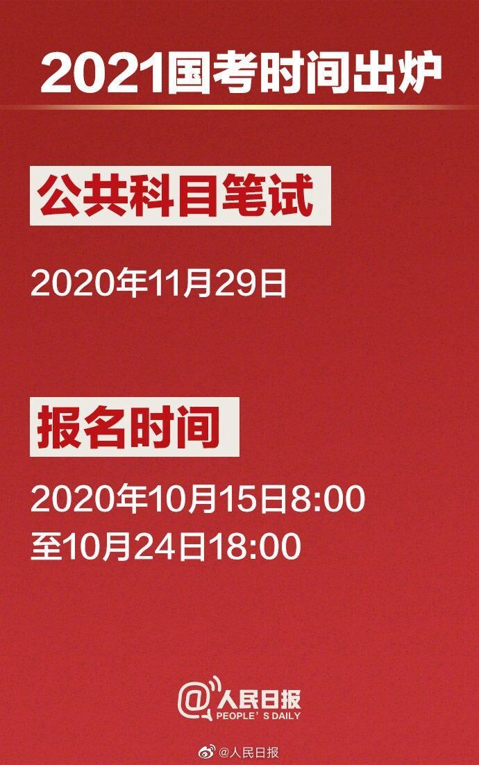 据国家公务员局网站,2021年国考公共科目笔试将于2020年11月29日举行,报考者可在2020年10月15日8:00至10月24日18:00期间登录考录专题网站,提交报考申请。