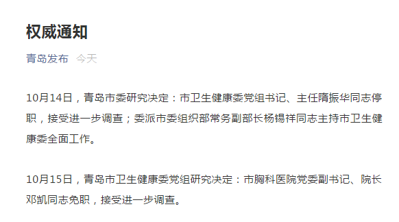 据青岛发布消息,10月14日,青岛市委研究决定:市卫生健康委党组书记、主任隋振华同志停职,接受进一步调查;委派市委组织部常务副部长杨锡祥同志主持市卫生健康委全面工作。