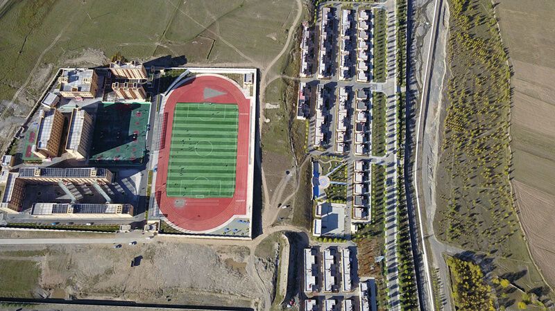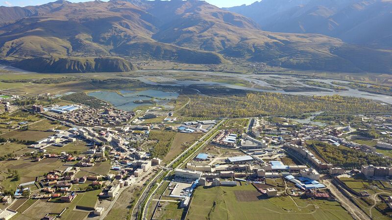 在甘孜州甘孜县吉绒隆沟易地扶贫安置点,旁边的十八军窑洞遗址群展现着这里的红色血脉。远处雪山座座相连,不远处县城边雅砻江河谷地带,景色醉人。