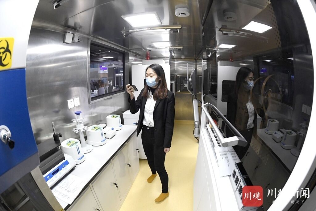 记者跟随负责人进入检测车内了解到,车厢内共有4个区域来进行检测相关工作,分别是试剂准备区、样本处理区、扩增分析区、灭菌区。首先通过传递窗传入样品,随后样品进入样本处理区进行一系列的样本处理和实验操作,最后进入扩增分析区得到结果。