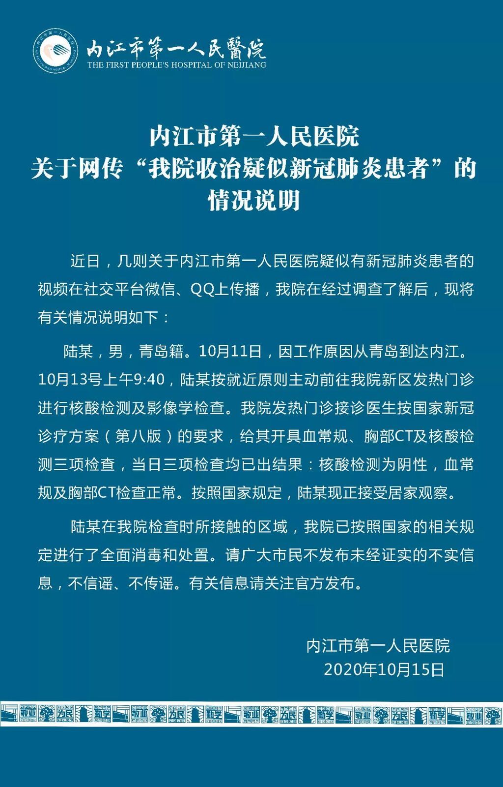为还原事实真相,解除广大市民的疑虑,我院经过深入调查,现将有关情况说明如下:陆某,男,青岛籍,因工作原因从青岛到达内江。10月13日9:40,陆某认真遵守内江市关于“从青岛入(返)内江须进行检测检查”的要求,按照就近原则,主动前往我院新区发热门诊进行核酸检测及影像学检查。我院发热门诊接诊医生按国家新冠诊疗方案(第八版)的要求,立即为其进行了血常规、胸部CT及核酸检测三项检查,当日三项检查结果表明:陆某核酸检测阴性,血常规及胸部CT检查正常。按照国家规定,陆某现正接受居家观察。陆某在我院检查时所接触的区域,我院按照国家的相关规定第一时间进行了全面消毒和处置。