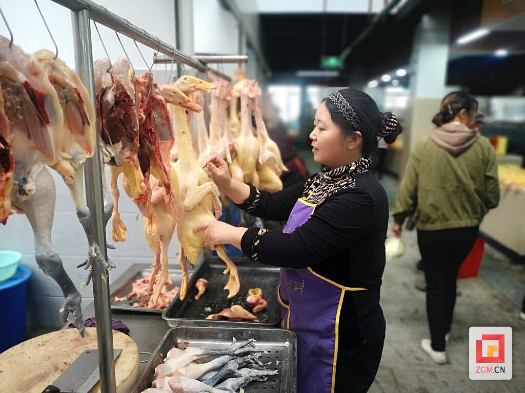 据嘉通农贸筱溪街市场负责人王亚春介绍,市场占地面积1万余平方米,现有店面200余户、摊位326户,市场原有经营户全部实现回迁安置。一楼主要为蔬菜、水产、干货区,二楼设家禽、肉类、熟食区和市民休憩空间。