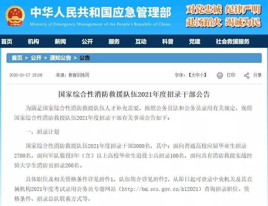 10月18日,记者从应急管理部网站获悉,国家综合性消防救援队伍2021年度招录干部3000名,其中:面向普通高校应届毕业生招录2700名,面向军队服役5年(含)以上高校毕业生退役士兵招录100名,面向具有消防救援实战经验大学生消防员招录200名。经过记者梳理,本次招聘中四川省消防救援共招聘90人。
