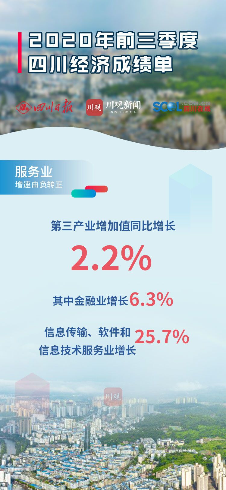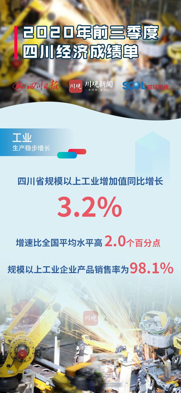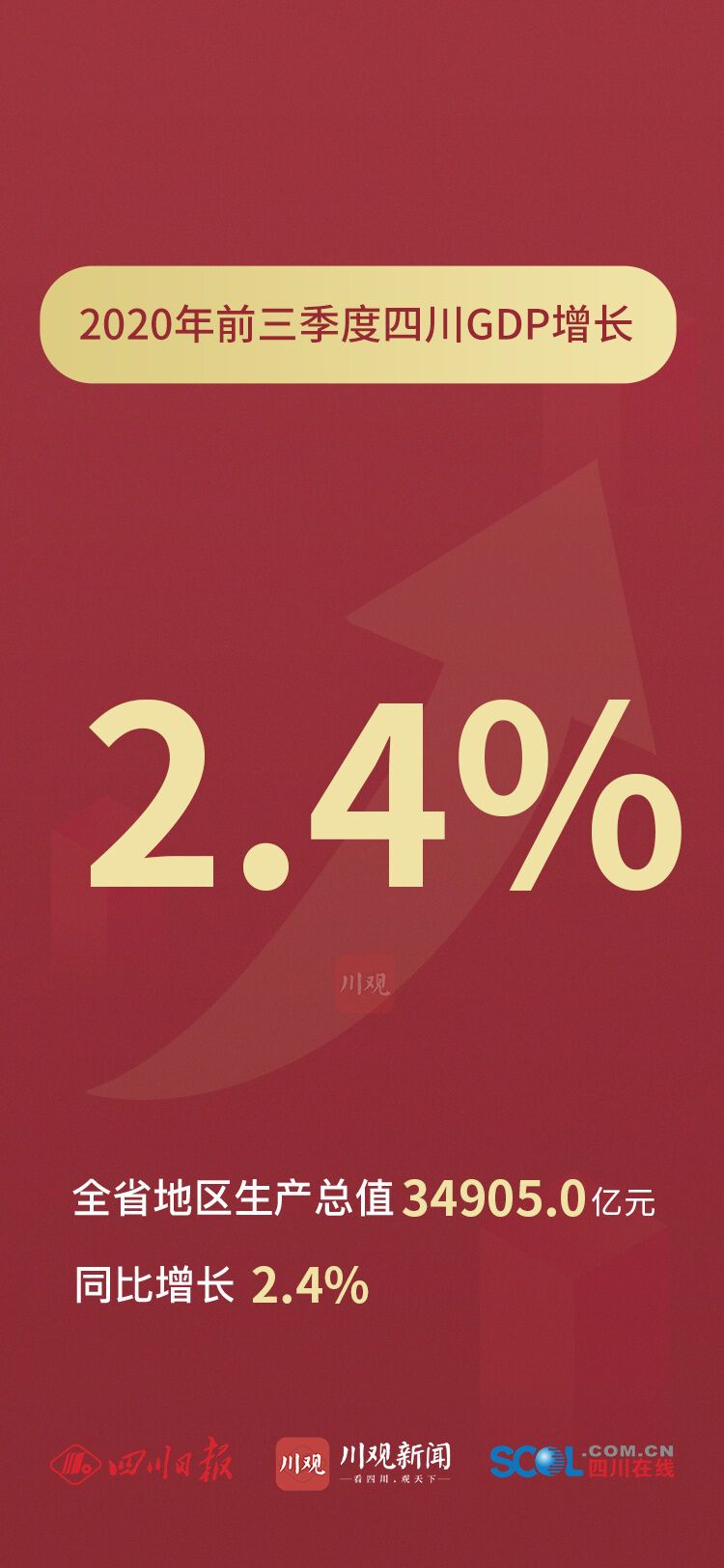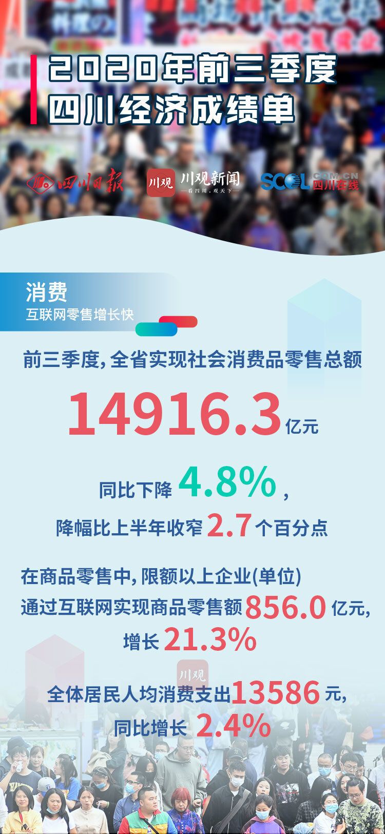10月20日四川发布2020年前三季度经济“成绩单”,前三季度全省地区生产总值(GDP)34905.0 亿元,同比增长2.4%。前三季度四川经济主要指标恢复情况如何?川观新闻发布9张海报,带你看懂“成绩单”!