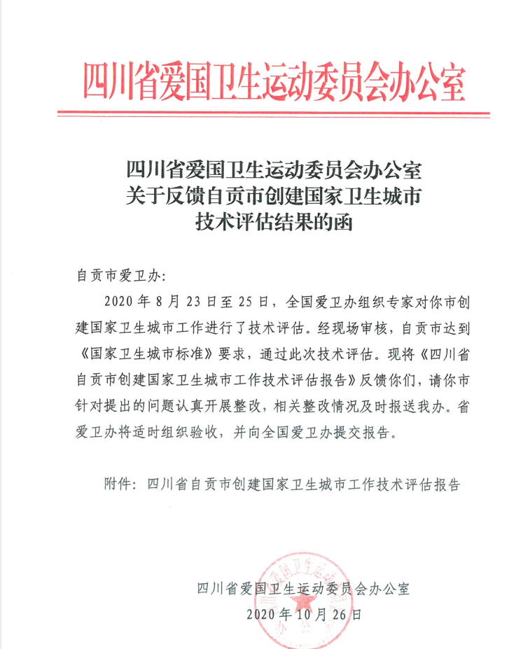 10月27日,记者从市创卫办获悉,自贡已收到《四川省爱卫办关于反馈自贡市创建国家卫生城市技术评估结果的函》。《函》中指出,自贡市达到《国家卫生城市标准》要求,通过国家卫生城市工作技术评估。技术评估组认为自贡市高度重视爱国卫生和创建国家卫生城市工作,不断加大城市基础设施建设,强化城市综合管理水平,创卫成果得到了群众好评,整体创建水平达到了《国家卫生城市标准》要求,并同意自贡市通过国家卫生城市工作技术评估。