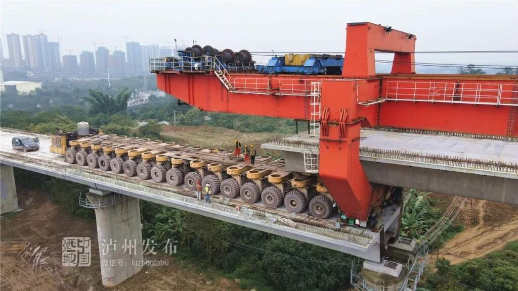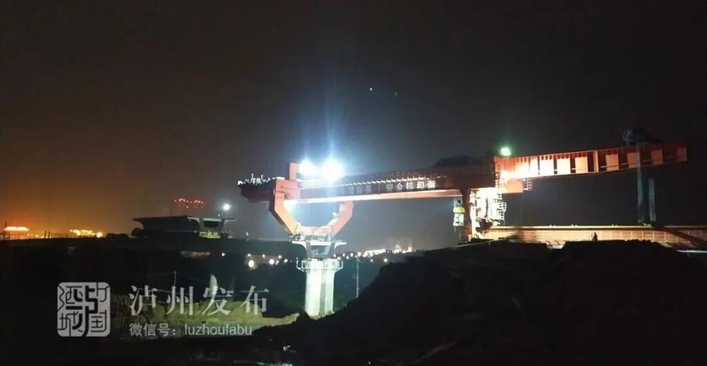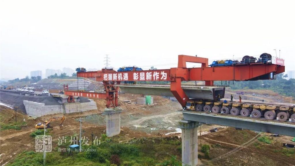 11月2日19:00,泸县制梁厂最后一榀双线箱梁在经历12个小时的长途运输后,终于抵达泸州高铁站蜀泸大道跨线桥最后一个架桥位置。20:30,在架桥机的作用下,重达720余吨的箱梁被缓缓升到指定位置后,平稳安放到桥位上。