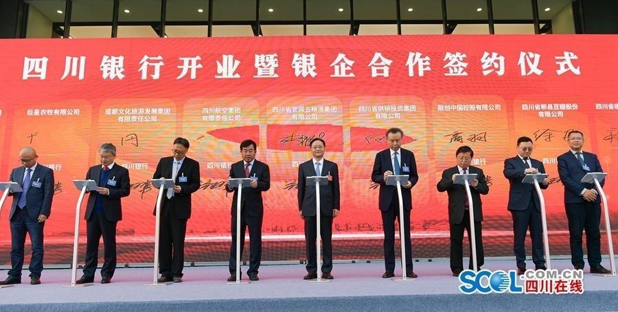 开业暨签约仪式上,中国人民银行成都分行向四川银行颁发《同意四川银行加入人民银行金融管理与服务体系通知书》,四川银保监局向四川银行颁发《金融许可证》;四川银行与18家实体经济企业签署银企合作协议,授信额度600亿元,涵盖“5+1”现代工业、“10+3”现代农业和“4+6”现代服务业。