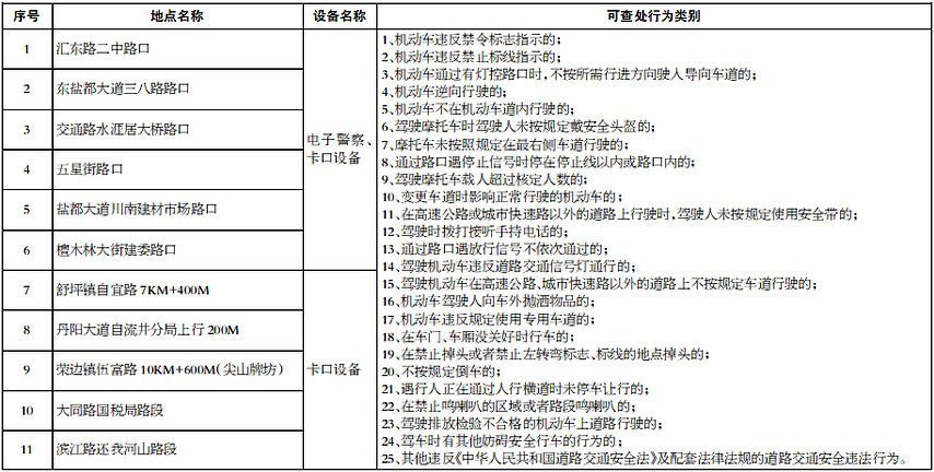 为规范道路交通秩序,创建安全、畅通、有序的道路交通环境,根据《中华人民共和国道路交通安全法》《中华人民共和国道路交通安全法实施条例》《四川省<中华人民共和国道路交通安全法>实施办法》等法律规定,现决定在以下道路点位、路段启用道路交通技术监控。以下公示点位将于2020年11月16日开始进行道路交通安全违法行为采集。