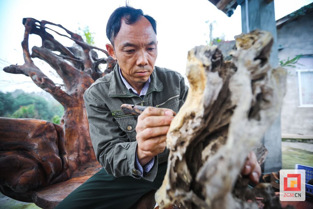 走进花园,置放在园子里的一些精美根雕吸引了记者的视线。“我曾经学过木工,一直对打磨根雕、栽盆景感兴趣,平时喜欢自己研究。”李荣威一边雕刻小毛驴座椅,一边给记者介绍道,从拾回木头到设计打磨,少则10余天,多则几个月,这些摆放的根雕都经过他自己精心打理。李荣威家中除了桃园,还有一片田园农场,有假山、亭子,院子里不仅栽种有时令蔬菜,还散养着100余只家禽。“生态惬意的田园农家一直是我俩的梦想。”李荣威表示,从前在外打工虽然挣得多,但他们始终没有归属感,回家后发展庭院经济,感觉生活更有盼头。