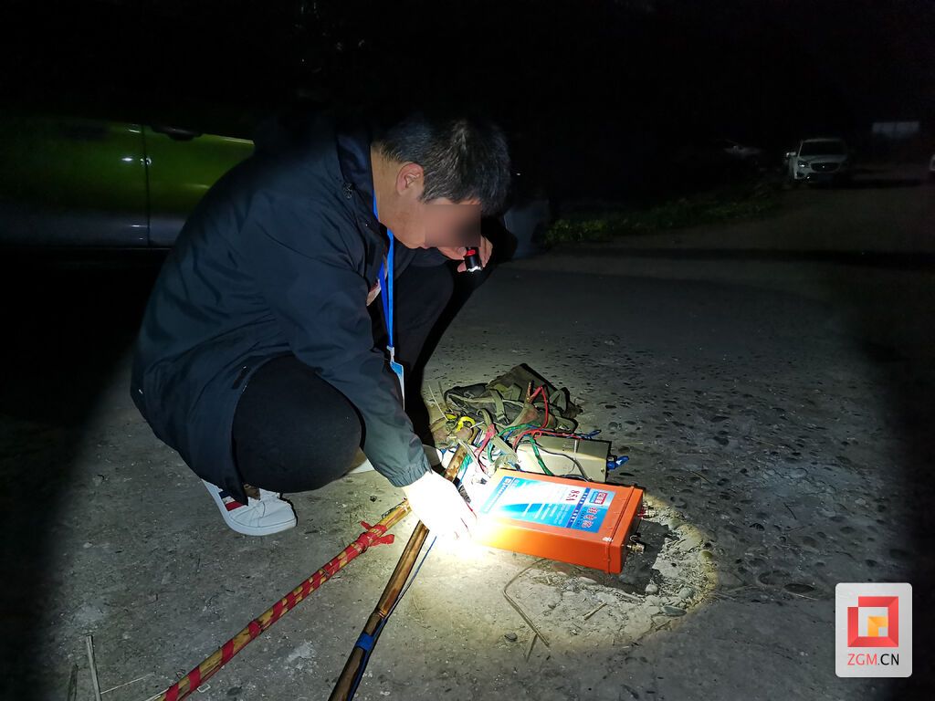 当晚8点左右,中心志愿者吕帅和另外两名志愿者汇合后,来到双河口大桥附近釜溪河一条小支流,发现两名男子乘着夜色,正利用电鱼工具“作案”,随即拨打了电话报警。大安区公安分局治安大队民警迅速赶到现场,从男子携带的编制袋里发现了半袋螃蟹,一数足足有上百只,并缴获了全套电鱼工具。