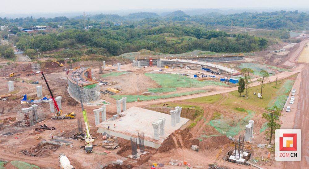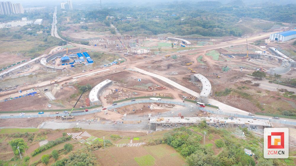 “为确保梁家坝互通现浇梁的顺利浇筑,我们从混凝土坍落度、强度、浇筑程序、振捣、收面和养护等一系列控制点管控现浇梁施工,在条件允许的情况下24小时推进项目。目前已施工完成桩基428根,承台100个,墩柱76个,现浇梁完成8联31跨。”现场技术管理人员李佳杰介绍,梁家坝互通立交是富荣产城融合带首个重难点控制性工程,主要包括4条主线桥以及8条匝道桥,桥梁全长2953.9米。