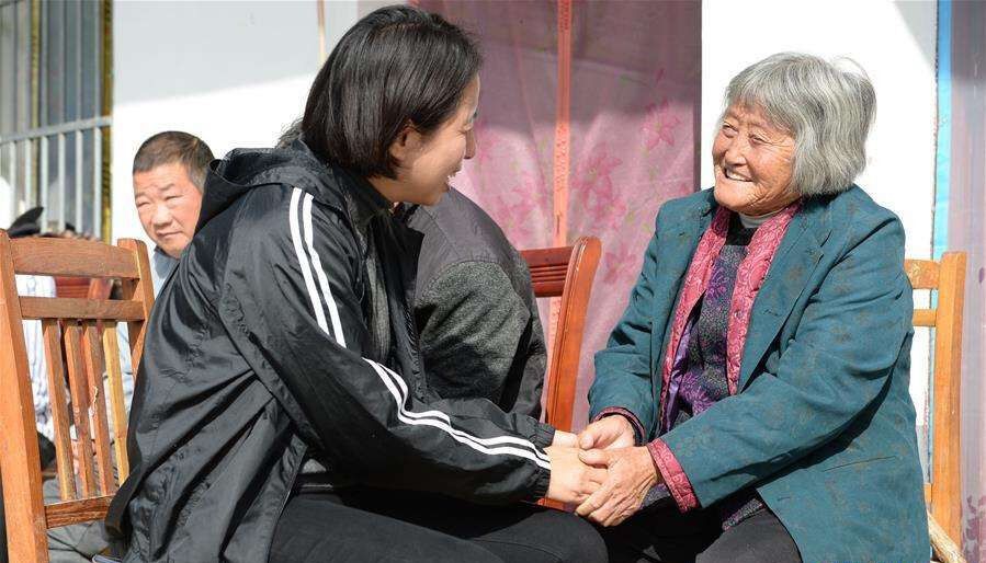 △刘双燕在安徽省亳州市利辛县的养老院内和老人交流。