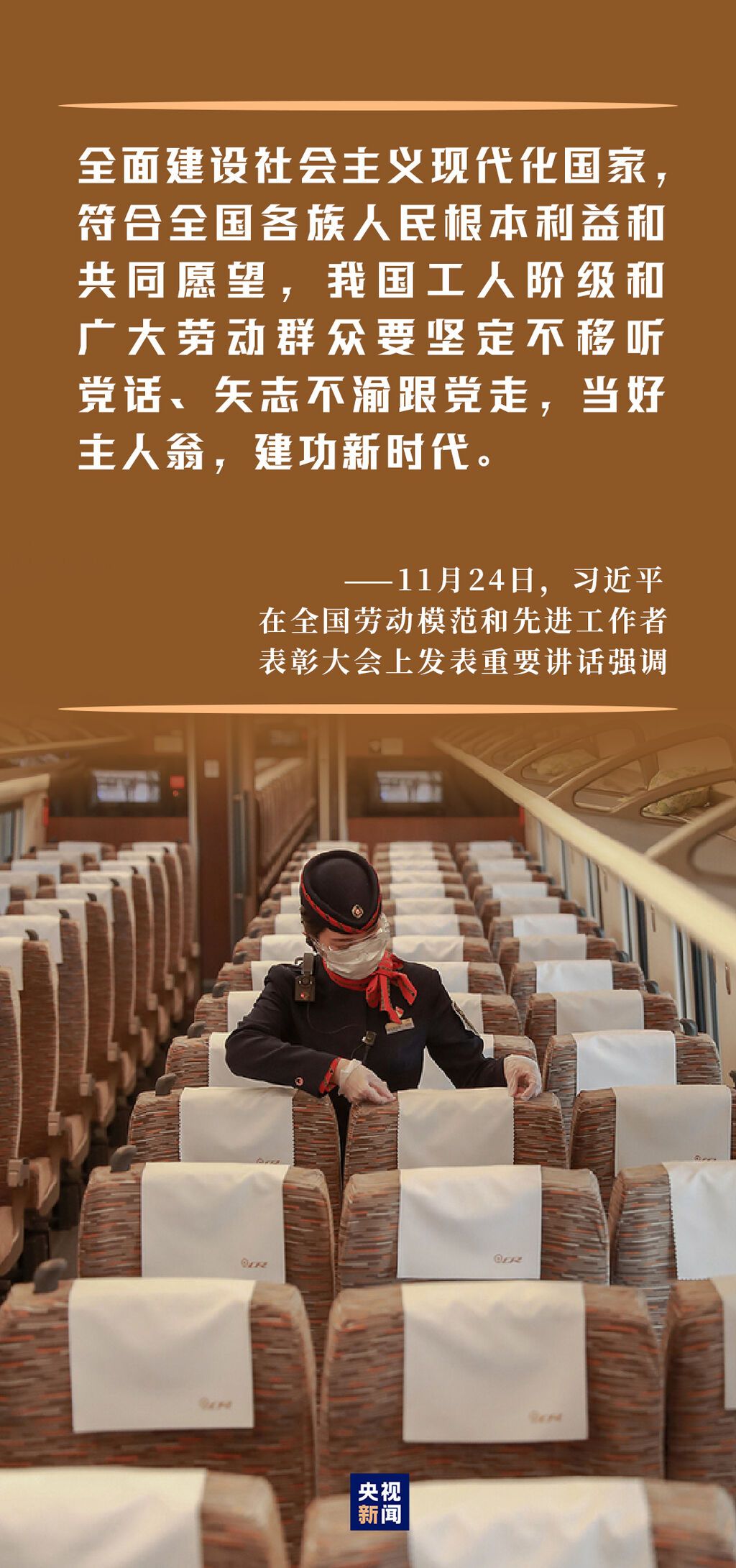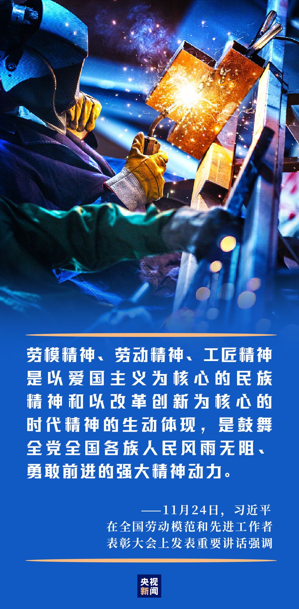 11月24日上午,习近平总书记在全国劳动模范和先进工作者表彰大会上发表重要讲话,点赞劳动模范是民族的精英、人民的楷模,是共和国的功臣,赞扬工人阶级和广大劳动群众用智慧和汗水谱写了“中国梦·劳动美”的新篇章,鼓舞全党全国各族人民大力弘扬劳模精神、劳动精神、工匠精神,在全面建设社会主义现代化国家新征程上创造新的时代辉煌。