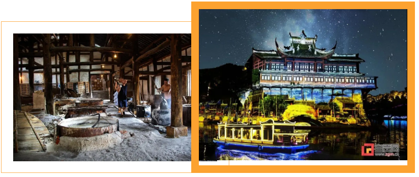 3. 自贡恐龙博物馆(大安区)—川南皮革城(大安区)—燊海井(大安区)—自贡盐业历史博物馆(自流井区)—夜游釜溪(自流井区)—自贡彩灯博物馆(自流井区)—荣县大佛(荣县)—海汤神泉(高新区)