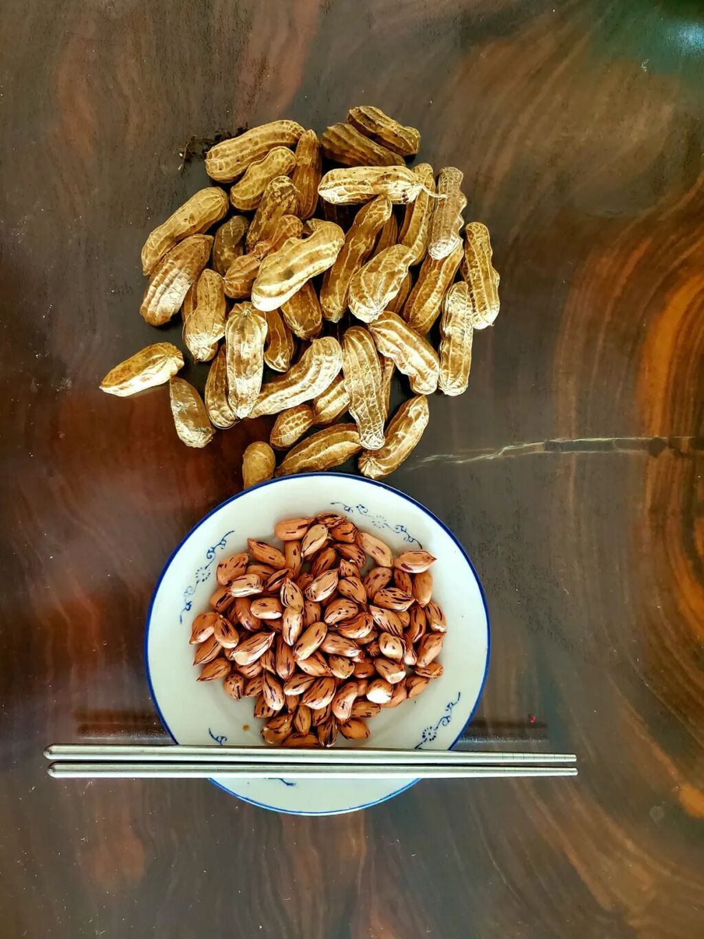 掰开花生的外壳,圆滚滚的水润的生花生仁,甚为诱人。三两粒一起入口,浓郁的香味、饱满的汁水、甜糯的口感,难免引得人食指大动,不消片刻,身边的花生壳便能聚成堆。