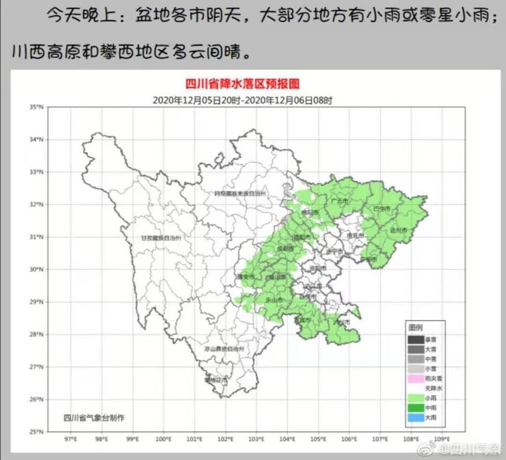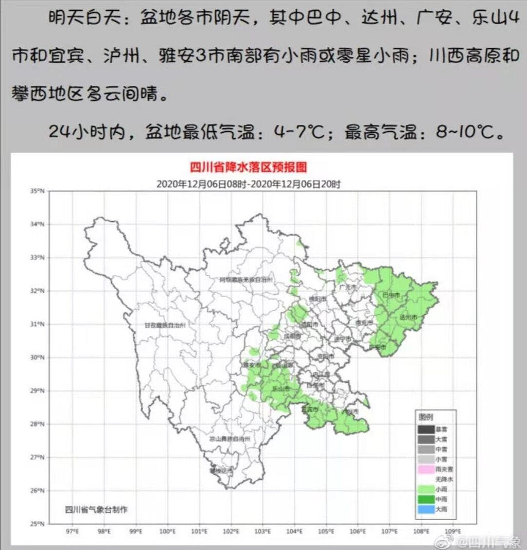 据四川气象消息,12月6日白天:盆地各市阴天,其中巴中、达州、广安、乐山4市和宜宾、沪州、雅安3市南部有小雨或零星小雨;川西高原和攀西地区多云间晴。24小时内,盆地最低气温:4-7℃;最高气温:8~I0℃。