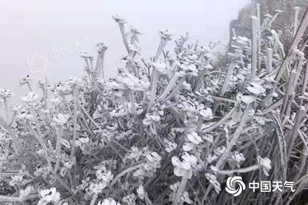 ↑昨天早晨,广东连山气温低迷,金子山风景区现大片雾凇。
