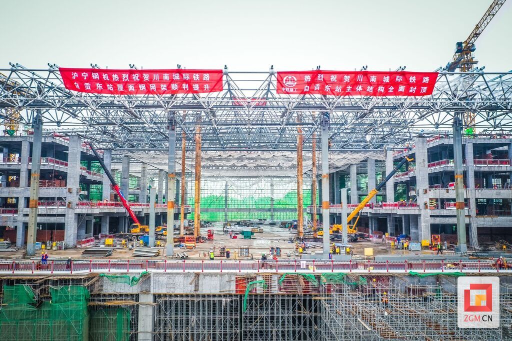 12月6日上午10点,经过8个多月的施工,在自贡东站站房项目建设现场,整个重达335吨的自贡高铁东站侧式站房钢结构屋盖网架顺利安装到指定位置,标志着自贡东站站房主体结构封顶,全面进入装饰装修阶段。