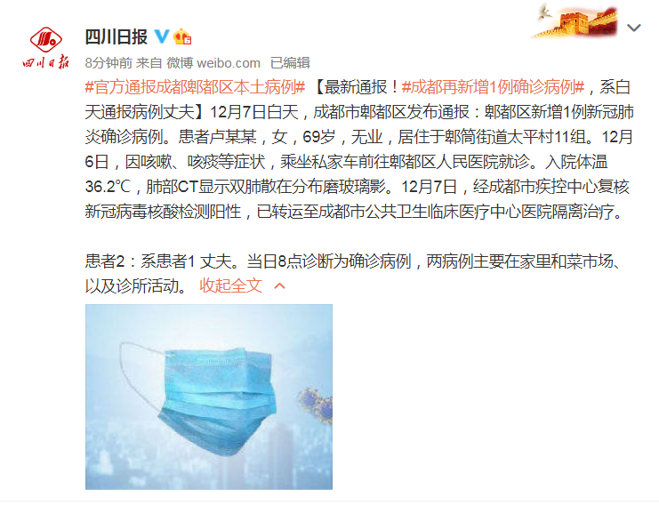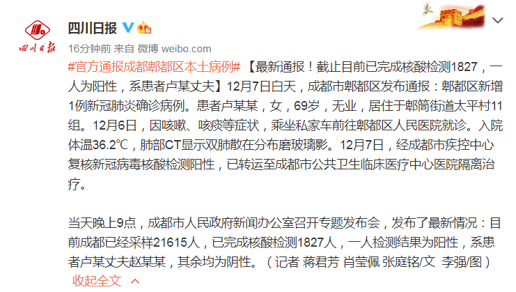 12月7日白天,成都市郫都区发布通报:郫都区新增1例新冠肺炎确诊病例。患者卢某某,女,69岁,无业,居住于郫筒街道太平村11组。12月6日,因咳嗽、咳痰等症状,乘坐私家车前往郫都区人民医院就诊。入院体温36.2℃,肺部CT显示双肺散在分布磨玻璃影。12月7日,经成都市疾控中心复核新冠病毒核酸检测阳性,已转运至成都市公共卫生临床医疗中心医院隔离治疗。