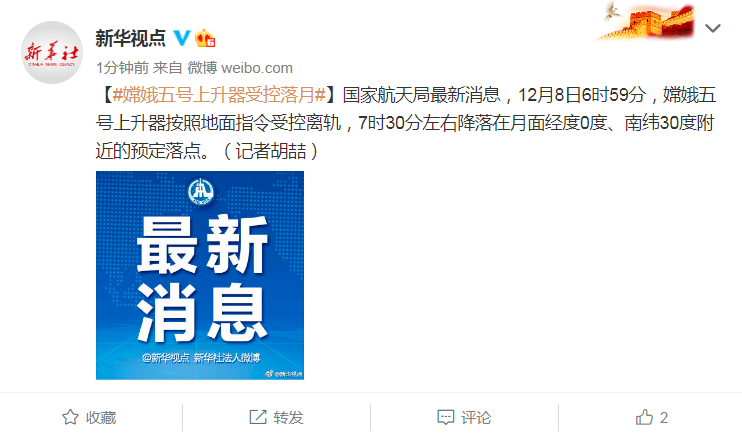 新华社北京12月8日电(记者胡喆)记者从国家航天局获悉,12月8日6时59分,嫦娥五号上升器按照地面指令受控离轨,7时30分左右降落在月面经度0度、南纬30度附近的预定落点。
