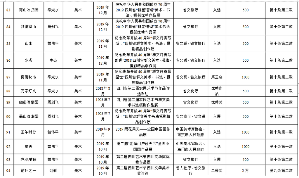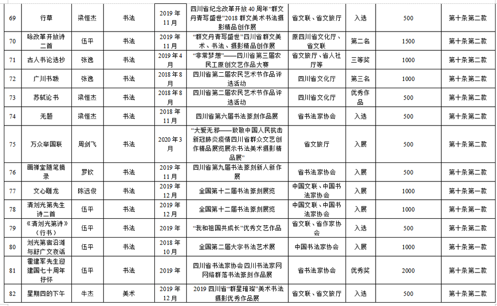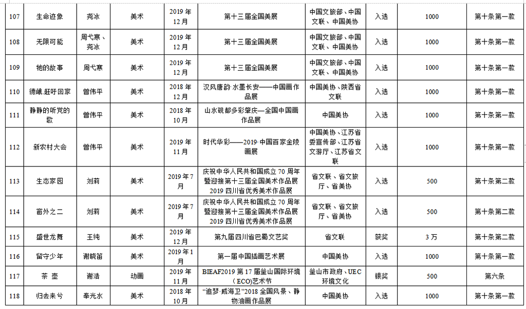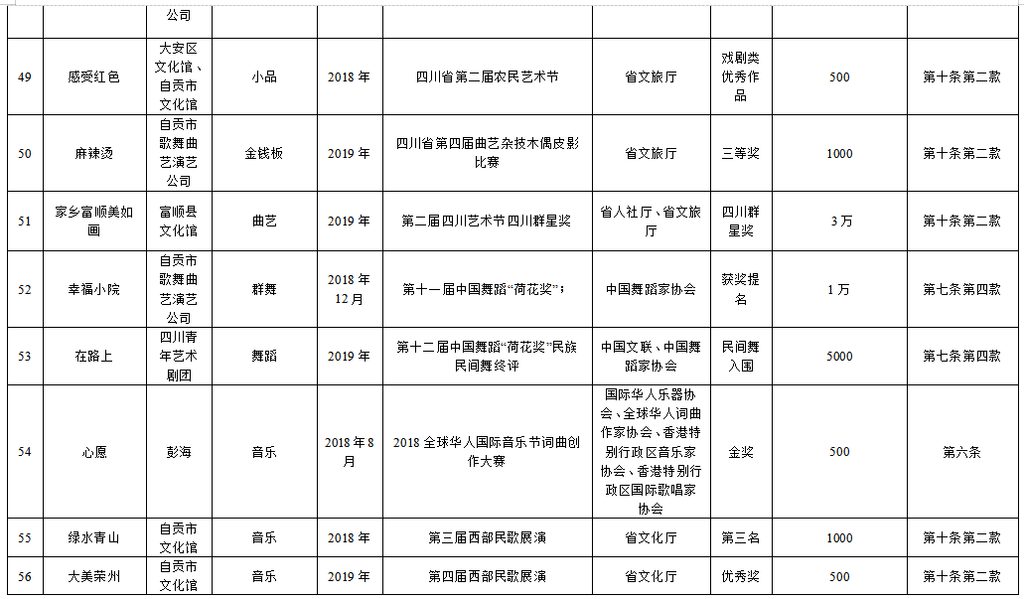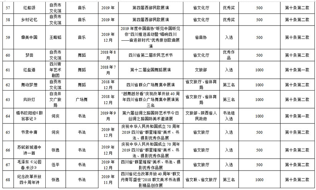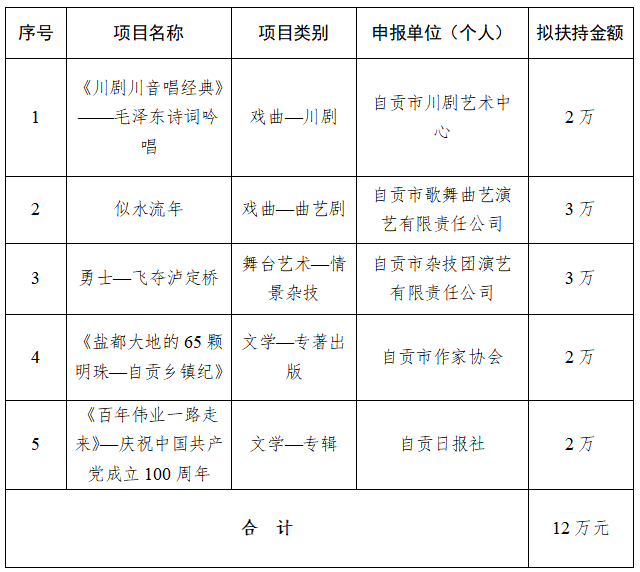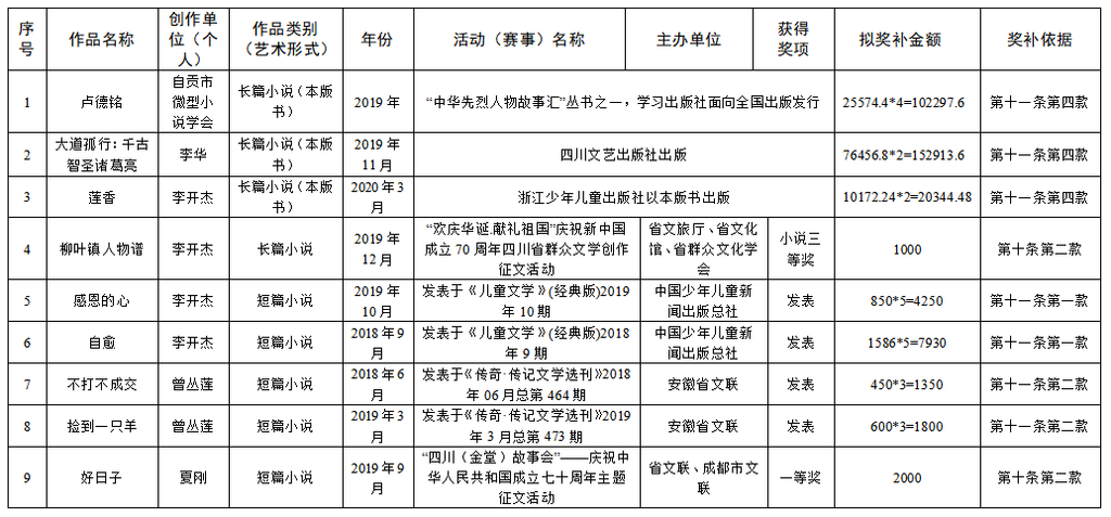 为繁荣文艺创作,推出更多精品力作,根据《自贡市优秀文艺作品扶持办法(修订)》(自委宣发[2019]18号)相关规定,经单位(个人)申报,各区县委宣传部、市文广新局、市文联分头初审,市优秀文艺作品扶持工作评审委员会复审,市优秀文艺作品扶持工作领导小组审定,拟扶持2020年度重大文艺题材创作项目5个、补助第二届获奖及发表文艺作品165件(名单附后),现予公示。