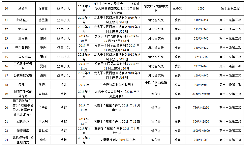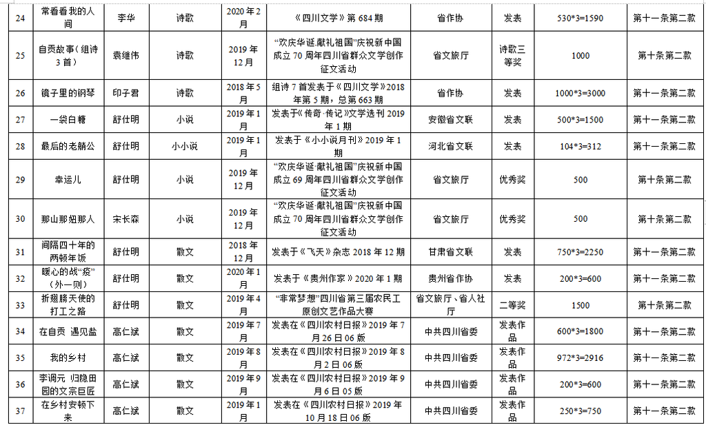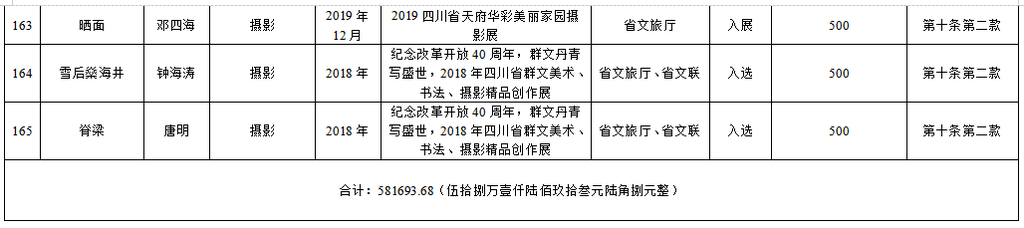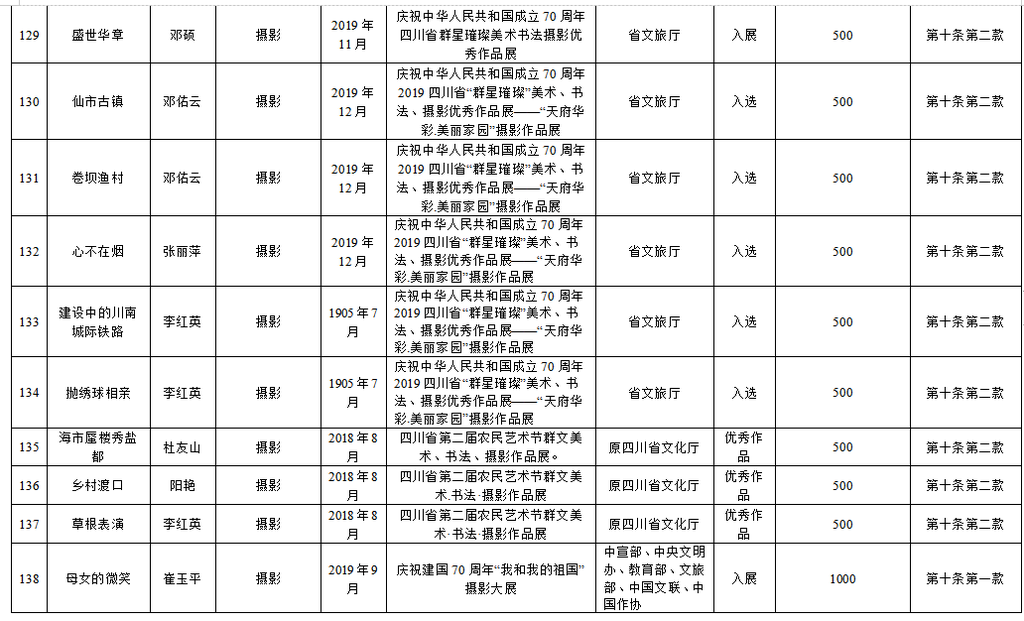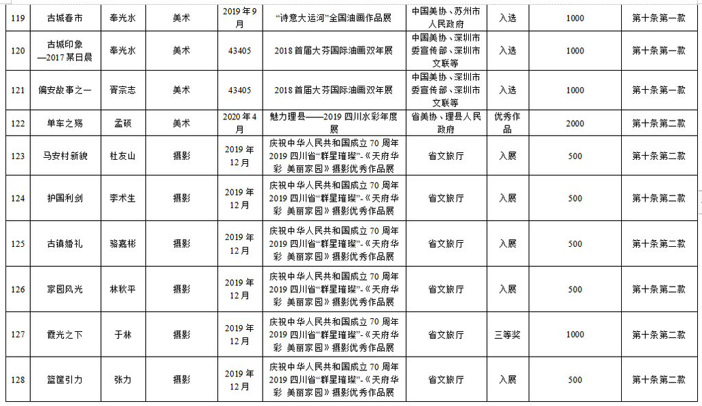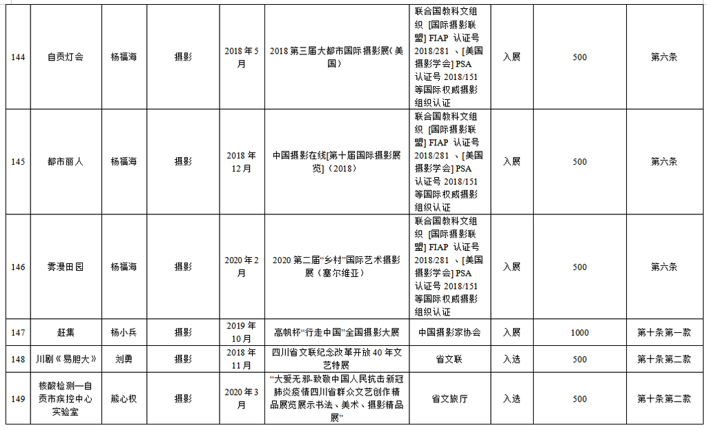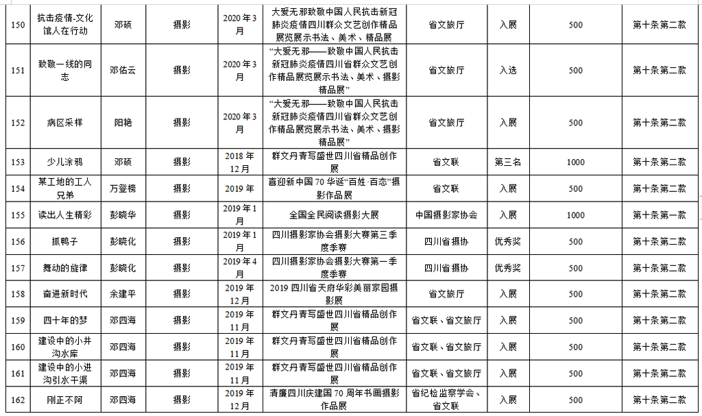 为繁荣文艺创作,推出更多精品力作,根据《自贡市优秀文艺作品扶持办法(修订)》(自委宣发[2019]18号)相关规定,经单位(个人)申报,各区县委宣传部、市文广新局、市文联分头初审,市优秀文艺作品扶持工作评审委员会复审,市优秀文艺作品扶持工作领导小组审定,拟扶持2020年度重大文艺题材创作项目5个、补助第二届获奖及发表文艺作品165件(名单附后),现予公示。